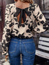Long-sleeve floral blouse with open back. Tied bow accent at the neckline. Feminine and flowy for daytime looks.