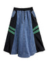 A maxi skirt featuring a two-tone patchwork design with a drawstring waistband. Offers a relaxed fit with a unique panel design.