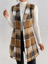 Long vest in a classic plaid pattern. Sleeveless design for layering versatility.
