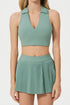 Stylish two-piece set with a sleek crop top and pleated skirt. The collared neckline adds a sporty and chic touch. Perfect for active or casual daywear.