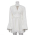 A mini dress with a deep plunge neckline, flared sleeves, and a cinched waist.