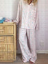 Loose fit pajama set with printed top and slit pants. Relaxed fit for cozy lounging.