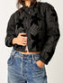 A quilted jacket with floral applique details, featuring a button-up front and a cropped silhouette.