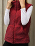Quilted sleeveless vest with a stand collar and front pockets. Provides warmth and style for layering over casual looks.