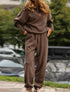 Knit lounge set with a loose-fitting top and matching pants. Relaxed silhouette for cozy wear. Suitable for lounging or errands.