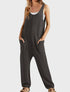 A sleeveless jumpsuit with a loose, relaxed fit and large front pockets, ideal for effortless styling.