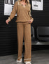 Ribbed lounge set with V-neckline. Relaxed fit top and wide-leg pants. Comfortable for at-home lounging.