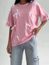 An top with round neckline, short sleeves, rosette embellished, and loose fitted silhouette.