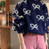 Round Neck Jacquard Bow Tie Long Sleeve Sweater
