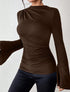 Long sleeve top with a ruched detail and bell sleeves. Designed with a fitted silhouette, perfect for adding elegance to casual outfits.