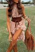 Flowy halter top with dramatic high-low ruffle detail. Matching shorts complete the coordinated and playful look. Ideal for statement outfits with a boho flair.