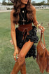 Flowy halter top with dramatic high-low ruffle detail. Matching shorts complete the coordinated and playful look. Ideal for statement outfits with a boho flair.