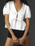 Ruffle collar blouse with a tie-front detail. Short sleeves and a peplum waist.