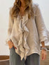A lightweight solid blouse with ruffle details along the neckline and sleeves, perfect for an elegant look.