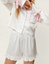 Pajama set with a ruffled hem and bow tie details on the sleeves. Includes a button-down top and elastic waist shorts. Soft and playful design.