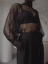 Turtleneck pullover with sequin mesh overlay. Adds a touch of sparkle to any outfit.