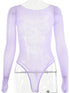 A long-sleeve bodysuit featuring a sheer mesh design with rhinestone embellishments.