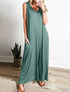 A jumpsuit with a sleeveless design, v-neckline, and a loose, flowing silhouette.