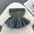 Smocked denim tube top with a flared peplum hem. Stylish and easy to pair with jeans or skirts. Adds a casual flair to your look.