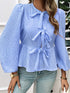 Long-sleeve blouse with bow-tie front. Peplum waist and puff sleeves.
