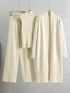 Three-piece lounge set with sleeveless top, wide-leg pants, and long coat. Solid color. Open-front coat.