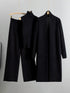 Three-piece lounge set with sleeveless top, wide-leg pants, and long coat. Solid color. Open-front coat.