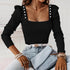 Feminine top with square neckline and puffed long sleeves. Decorative accents add a chic touch.