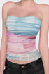 Stylish strapless tank top featuring a unique print design. Offers a flattering ruched detail for added elegance. Perfect for casual outings and summer events.