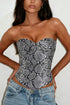 Stylish bustier top featuring a bold snake print design. Offers a flattering silhouette with a fitted strapless cut. Perfect for adding a touch of edge to casual outfits.