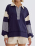 A cozy pullover with a mix of solid and striped panels, featuring a relaxed fit and V-neckline for a casual, effortless style.