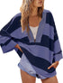 A striped pullover poncho with a relaxed fit and a deep V-neck. A stylish option for layering during cool weather.