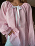 Lightweight blouse with a striped pattern and ribbon tie at the neckline. Relaxed fit with billowy sleeves. Suitable for casual outings.