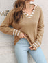 Knit pullover sweater with a striped V-neckline and cuffs. Relaxed fit for casual and cozy styling. Suitable for year-round wear.