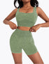 Two-piece activewear set featuring a tie-dye design. Includes a sports bra and high-waisted shorts.