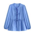 A blouse featuring a bow-tie front design, peplum hem, and long puff sleeves.
