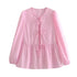 A blouse featuring a bow-tie front design, peplum hem, and long puff sleeves.