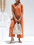 A wide-leg jumpsuit with tie straps and a v-neckline, combining comfort with a chic design.