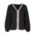 V-neck blouse with leopard print trim detail. Features long bishop sleeves and a flowy fit. A stylish addition for everyday wear.