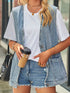 A sleeveless denim vest featuring V-neckline, button closures and front pockets, ideal for layering over casual outfits.