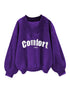 A V-neck pullover with a relaxed fit. Features a bold "Comfort" print for a cozy look.