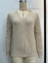 Comfortable pullover with V-neckline and crochet sleeve details. Loose fit offers everyday style. Pairs well with jeans or skirts.