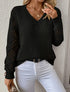 Comfortable pullover with V-neckline and crochet sleeve details. Loose fit offers everyday style. Pairs well with jeans or skirts.