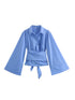 A wrap-style blouse featuring wide bell sleeves and a tie at the waist for a flattering silhouette.